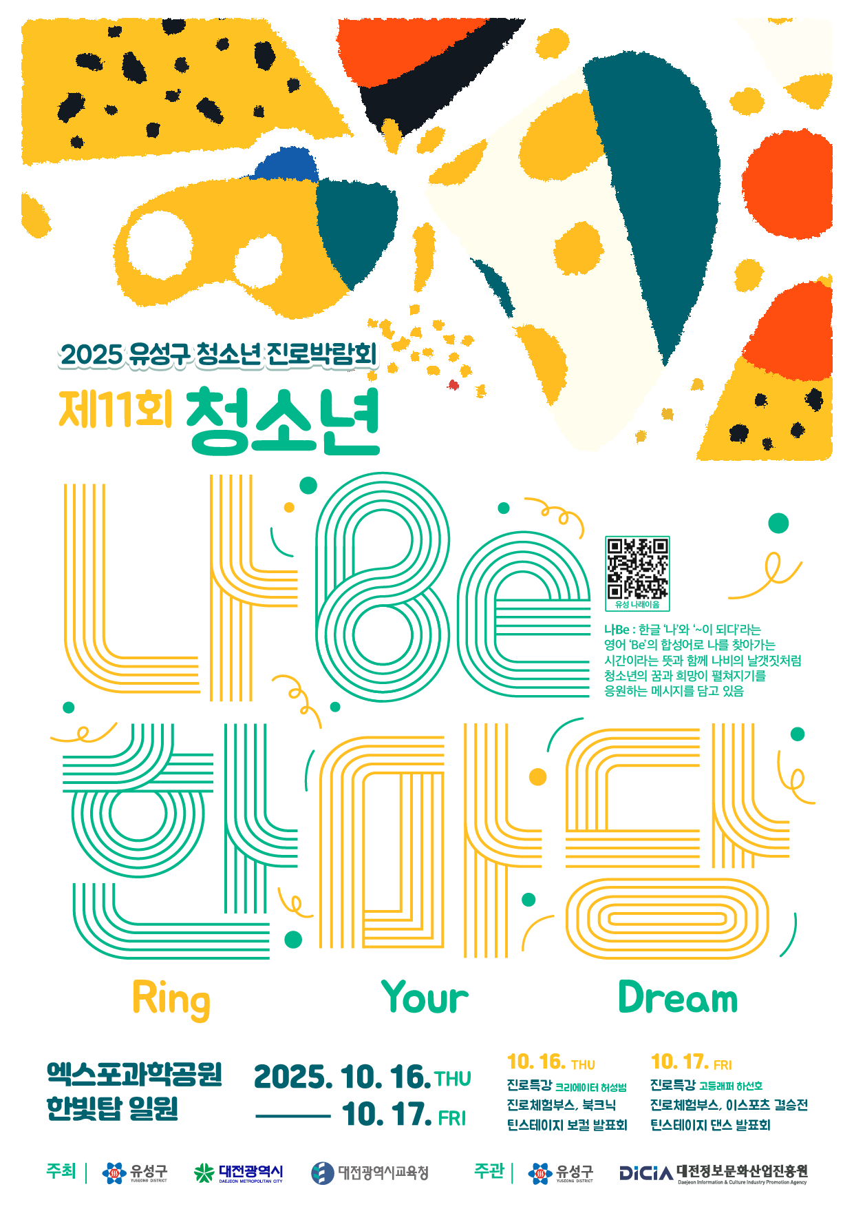 대전광역시 유성구에서는 지역대학과 협력하여 청소년의 꿈과 미래를 응원하는 진로직업체험박람회 '제11회 청소년 나be 한마당'을 개최합니다. 청소년 진로탐색을 위한 행사의 원활한 진행을 위하여 많은 지원 바랍니다.