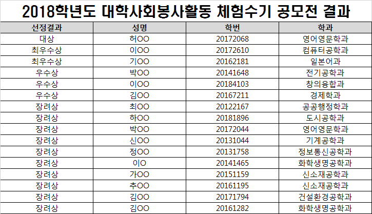 2018학년도 대학사회봉사활동 체험수기 공모전 결과 및 시상식 안내